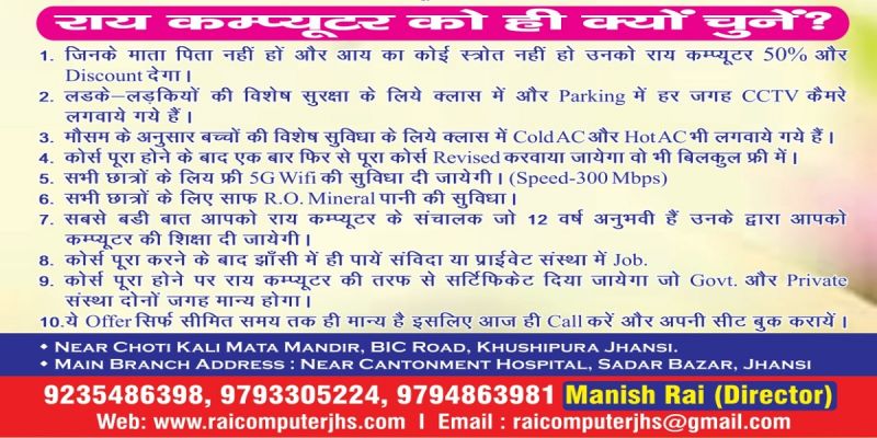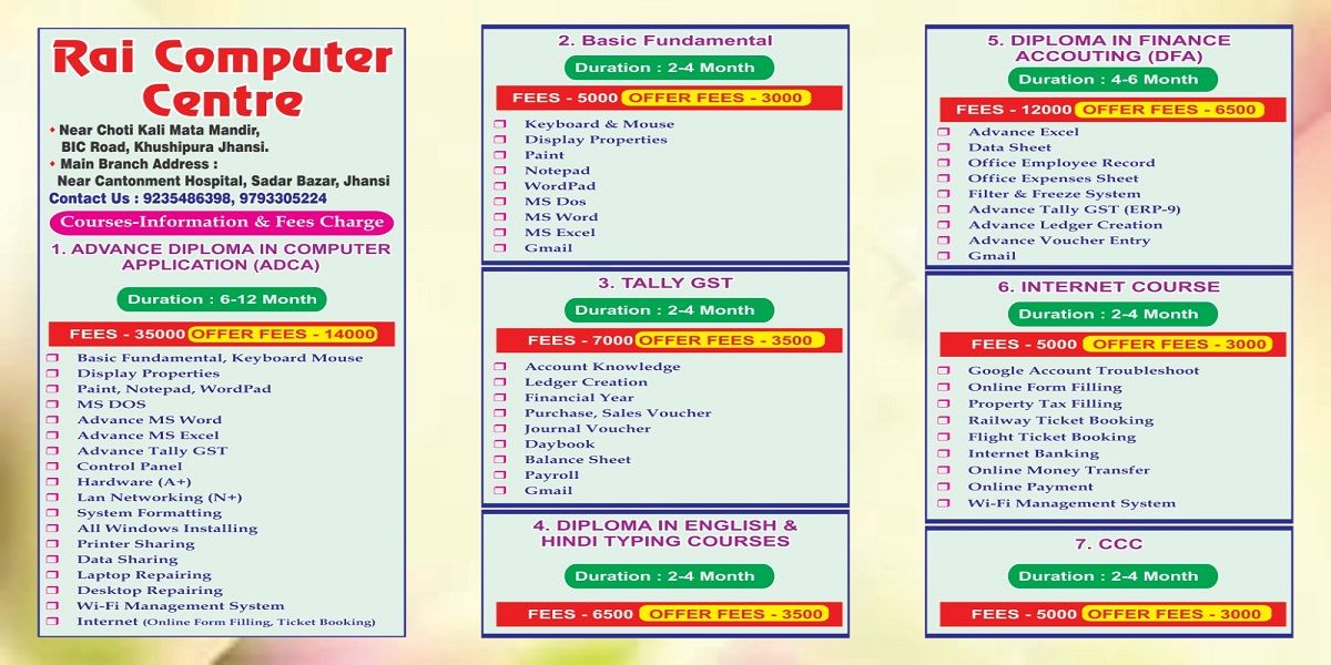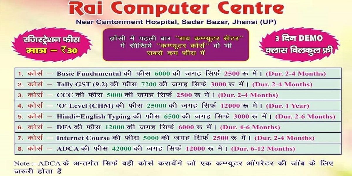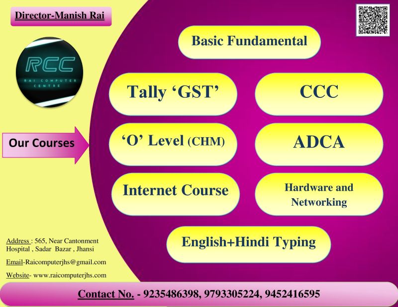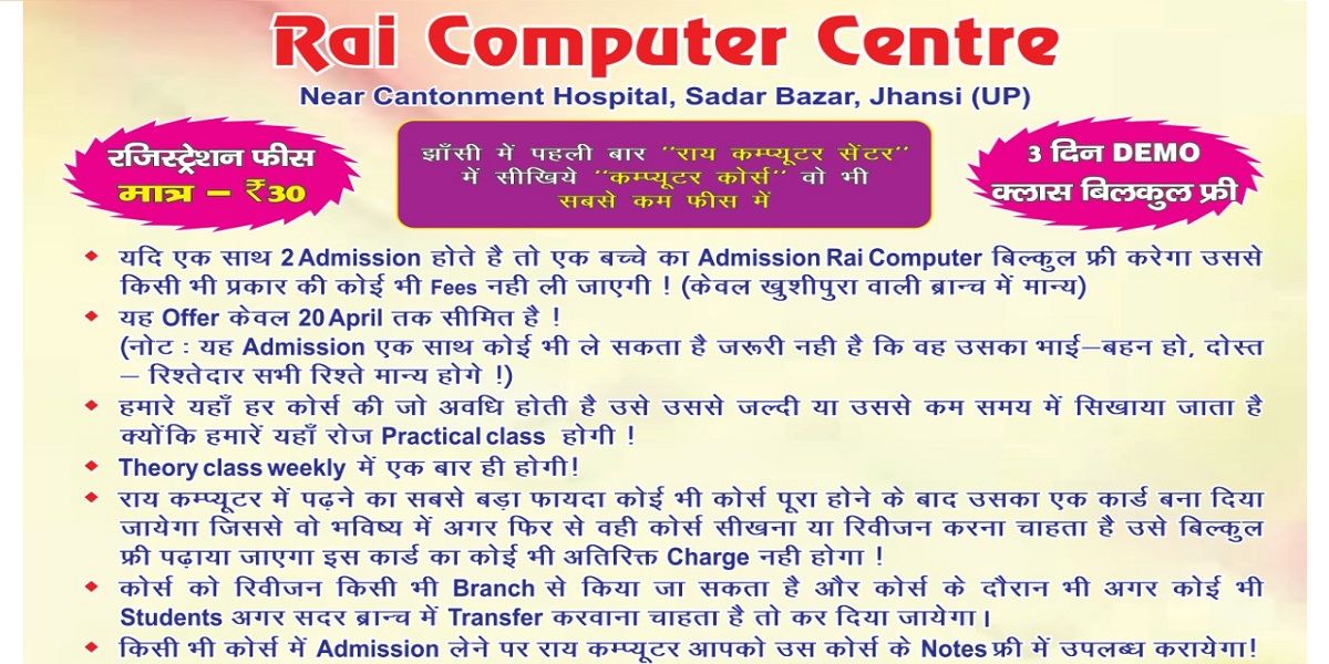 Rai Computer centre is one of the fastest growing computer education centre in Jhansi ,who has not compromised quality of education . We have built the environment with the view to motivate the students to pursue their studies in a conductive way. Rai computer centre provide courses for student and employees who want to upgrade their job skills and job profiles. We have a team of dedicated professional trainers to prepare students for the latest technical skills, they also provide quality education and provide proper career guidance to the students ,it help them to make a better career we offer the courses to the students so that they will become job ready after completion of the course. We provide the courses from basic to advance level. The trainers at the institute will train you in each specific domain.